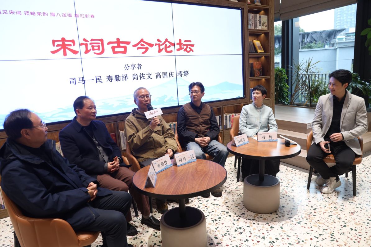 揭幕礼成的余热未尽,一场聚焦宋词与宋韵的文化论坛便热烈开启,将现场气氛推向高潮。新书作者司马一民先生,浙江省宋韵文化研究中心学术委员办公室主任寿勤泽先生,杭州出版社总编辑、浙江省文史研究馆研究员尚佐文先生,中国新闻技术工作者联合会出版融媒体技术分会副秘书长、湖州师范学院人文学院教授高国庆先生,浙江教育出版社集团总编辑蒋婷女士,联袂开启一场宋词古今论坛,分享“遇见”系列图书出版的心路历程,探讨宋词的文化风采与精神内核。大咖云集的阵容,为论坛增添了专业深度与文化分量。