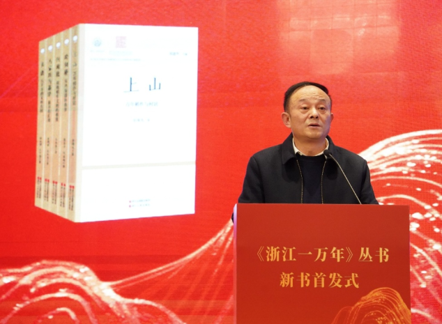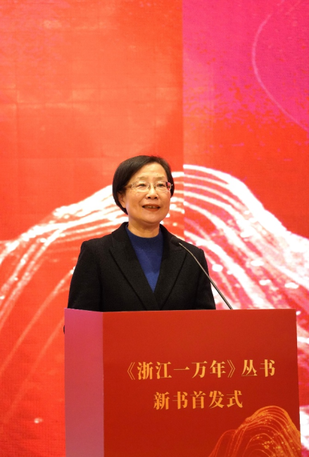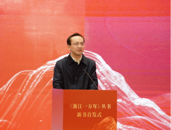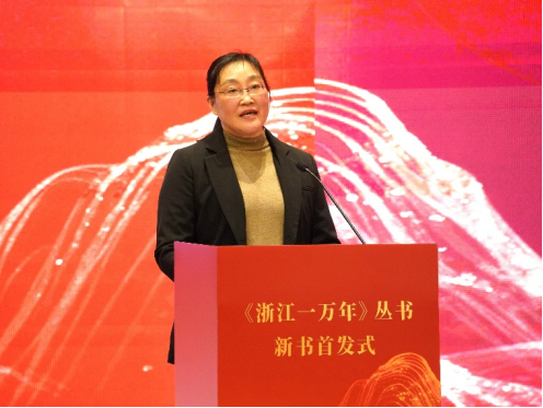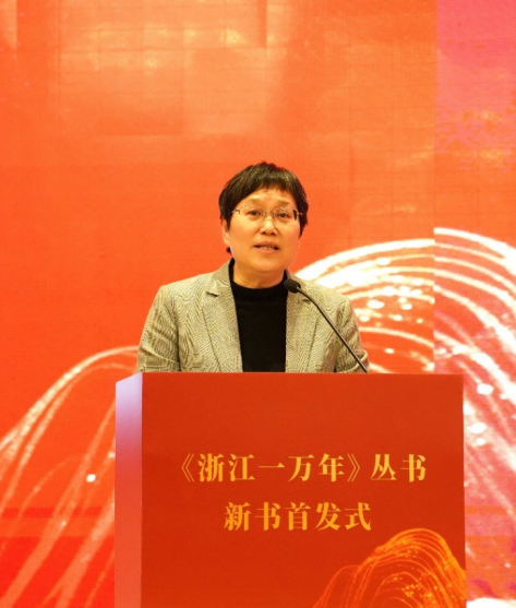 浙江省委宣传部部务委员骆莉莉祝贺丛书出版,她提道,《浙江一万年》丛书既讲浙江又讲中国,既讲学术又讲大众,生动地展现了浙江在中华文明起源形成发展历程中的重要地位,为我们理解中华文明多元一体格局提供了生动的地方实践和区域样本,具有重要的学术价值与社会意义。她指出,要以丛书的发布为起点,把好的研究方法、研究经验总结传承下去,把浙江一万年的课题做深做实,持续推进考古实证,深化考古学科融合研究,加快成果创新转化。