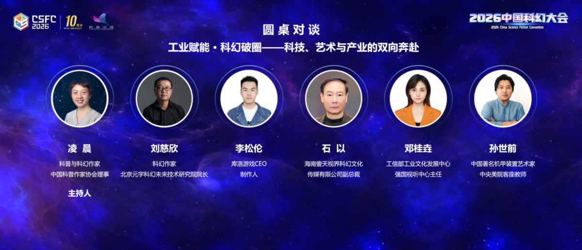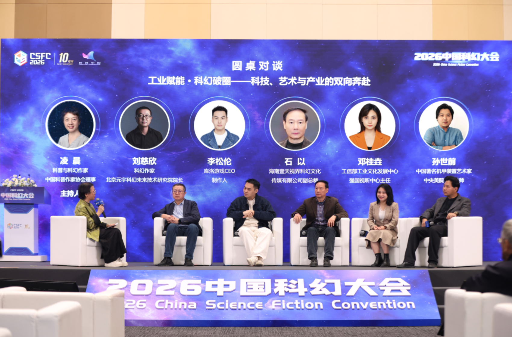 在圆桌对谈环节,各领域嘉宾围绕科幻破圈和跨文化转化等话题发表了精彩观点。科幻作家凌晨与科幻作家刘慈欣、库洛游戏CEO李松伦、海南壹天视界科幻文化传媒有限公司副总裁石以、工信部工业文化发展中心强国视听中心主任邓桂垚、中国著名机甲装置艺术家孙世前,围绕“工业赋能·科幻破圈——科技、艺术与产业的双向奔赴”展开对谈,对谈嘉宾结合自身领域,探讨了工业技术与自身实践的双向传递和协同共生。