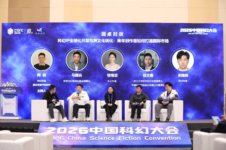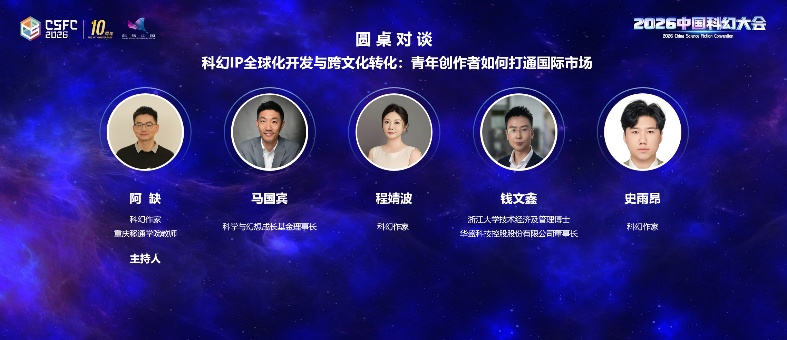 科幻作家、重庆移通学院教师阿缺与科学与幻想成长基金理事长马国宾,科幻作家程婧波,浙江大学技术经济及管理博士、华盛科技控股股份有限公司董事长钱文鑫,科幻作家史雨昂,围绕“科幻IP全球化开发与跨文化转化:青年创作者如何打通国际市场”展开对谈,分享了本土科幻作品IP在对接国际市场和资源方面的经验,探讨了中国科幻如何在国际市场建立差异化竞争力。