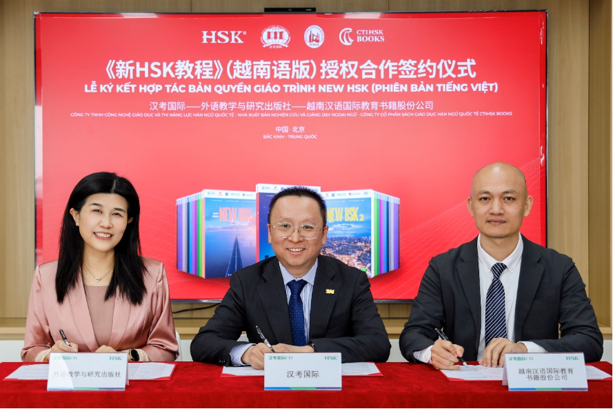 2026年4月3日,汉考国际、外语教学与研究出版社(外研社)与越南汉语国际教育书籍股份公司正式签署《新HSK教程》(越南语版)授权合作协议,这是《新HSK教程》在海外的首次授权出版与推广。