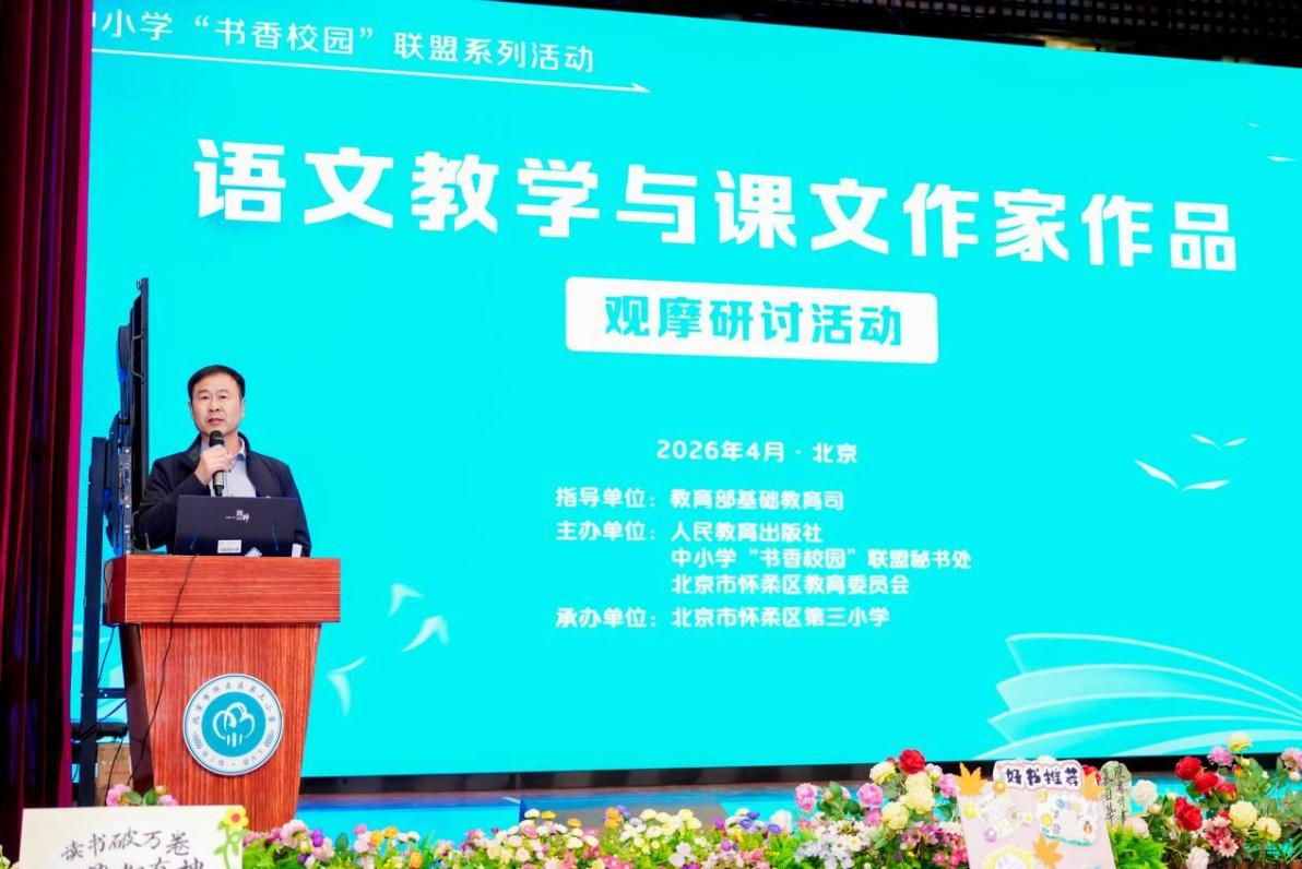 为深入贯彻习近平总书记关于推动全民阅读、建设书香社会的重要指示精神,落实《全民阅读促进条例》与《全国青少年学生读书行动实施方案》要求,4 月 10 日,由教育部基础教育司指导,人民教育出版社、中小学“书香校园”联盟秘书处、北京市怀柔区教育委员会主办,北京市怀柔区第三小学承办的中小学“书香校园”联盟系列活动之“语文教学与课文作家作品”观摩研讨活动在京成功举办。中小学“书香校园”联盟校部分优秀教师与怀柔区骨干教师齐聚一堂,共探语文阅读教学新路径,推进书香校园建设。