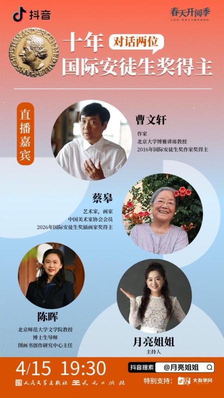 北京时间4月15日晚,一场备受瞩目的文化对谈在线上拉开帷幕。主题为“十年,对话两位国际安徒生奖得主”的直播活动,由人民文学出版社、天天出版社联合主办,并通过人民文学出版社、天天出版社、月亮姐姐社交媒体账号,以及中国作家网、澎湃新闻等多个平台同步直播。活动汇聚了两位国际安徒生奖得主——2016年获奖作家曹文轩与2026年新晋获奖插画家蔡皋,并特邀北京师范大学教授、图画书创作研究中心主任陈晖作为嘉宾,由深受大小朋友喜爱的“月亮姐姐”担任嘉宾主持。四位嘉宾围绕中国原创儿童文学与图画书的过去、现在与未来,畅谈创作的源泉、美的力量与童心的价值。直播全网观看人数突破200万,展现了公众对中国文化软实力与原创童书发展的高度关注。