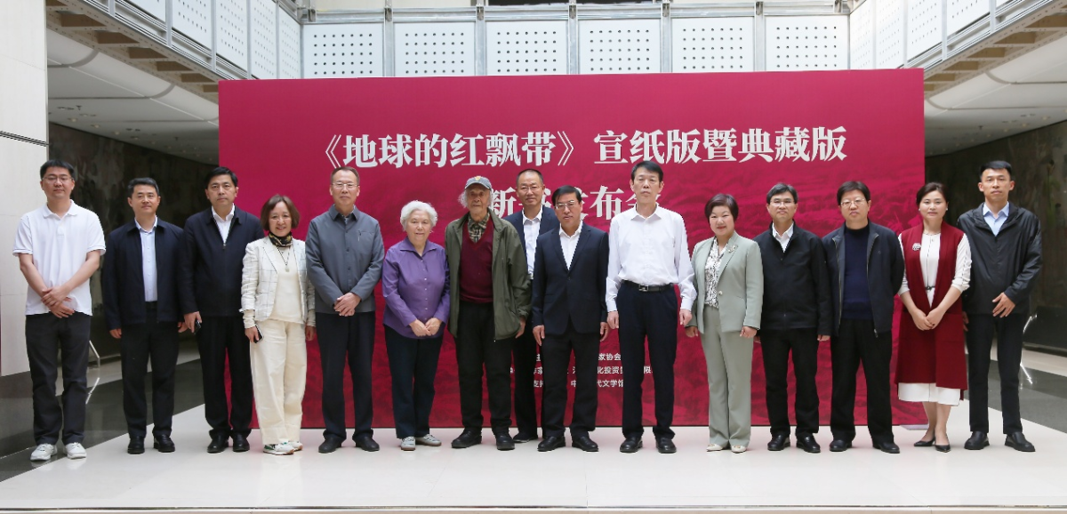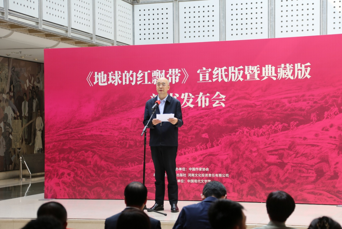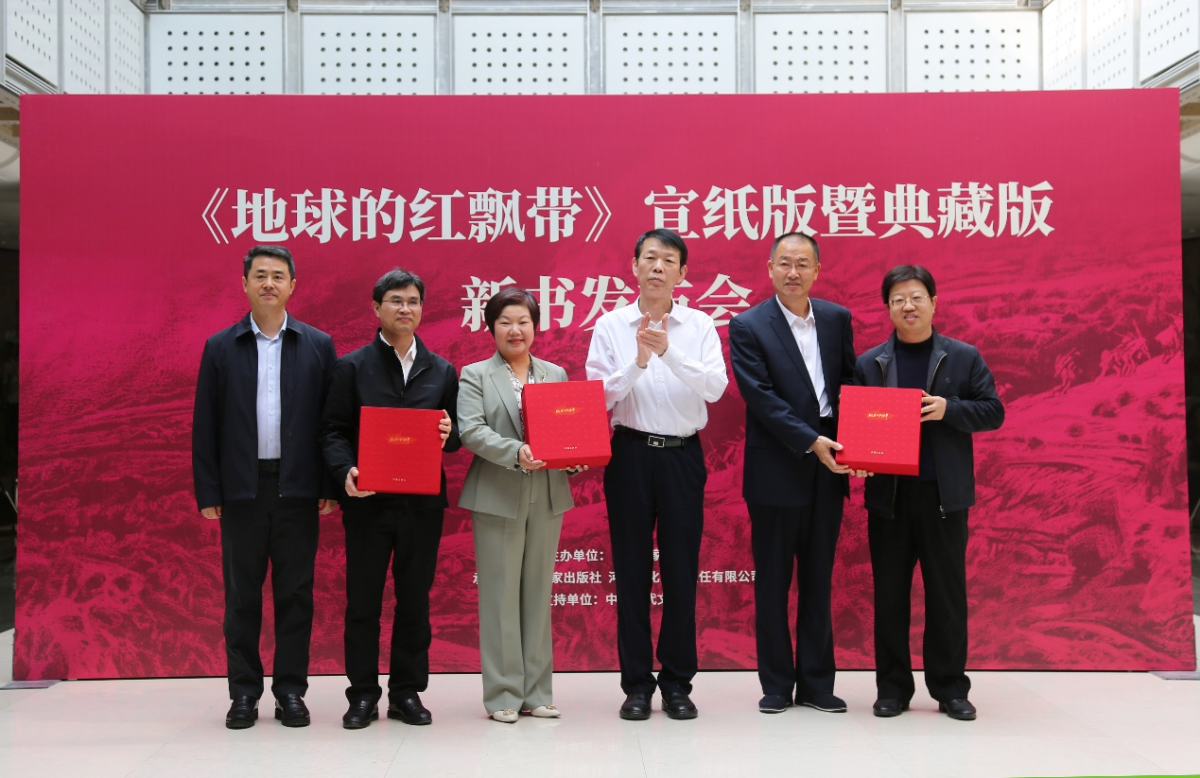 2026年4月18日下午,中国作家协会主办,作家出版社、河南省文化产业投资有限责任公司承办的《地球的红飘带》宣纸典藏版和宣纸版新书发布会在中国现代文学馆举行。中国作家协会党组成员、副主席、书记处书记吴义勤,国家文物局革命文物司司长彭跃辉,中国现代文学馆常务副馆长王军;著名画家、本书绘画作者沈尧伊先生,著名作家魏巍先生儿媳王曼曼女士,刘亚楼将军女儿刘煜鸿女士,于都中央红军长征集结出发历史博物馆党组成员钟敏,古田会议纪念馆办公室主任江敏,瑞金中央革命根据地纪念馆研究员刘洪,以及河南省文化旅游投资集团有限公司党委书记、董事长张立新,作家出版社总经理王松等参加活动。发布会由作家出版社社长鲍坚主持。会上,吴义勤、张立新、沈尧伊、王曼曼、刘煜鸿分别致辞,共同为新书揭幕。作家出版社还向中国现代文学馆、中央红军长征集结出发历史博物馆、古田会议纪念馆和瑞金中央革命根据地纪念馆捐赠新书。