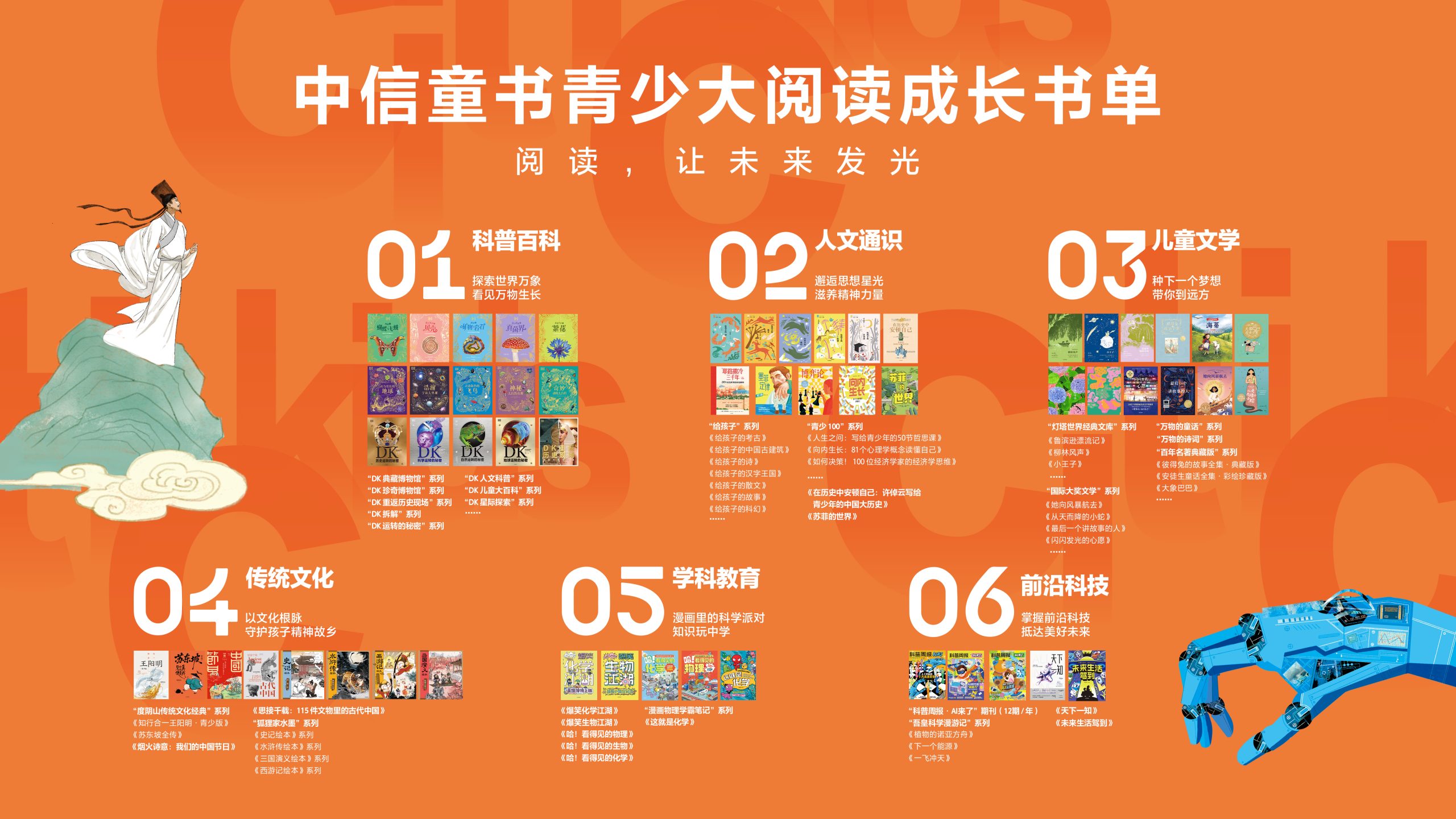 作为深耕少儿阅读领域十余年的专业品牌,中信童书紧跟“十五五”期间文化产业高质量发展与全民阅读深化推广的部署,积极推进从“图书供应商”向“儿童成长服务商”的战略升级,着力构建“书、课、物、场”全场景融合的阅读服务生态。品牌严格遵循《全民阅读促进条例》中贴合少年儿童心智发展与认知规律推行阶梯阅读的要求,整合优质内容资源,正式发布中信童书青少大阅读成长书单。书单立足青少年成长规律与阅读需求,覆盖人文历史、科普百科、传统文化、儿童文学、前沿科技等六大核心领域,搭建起贯通全学龄、适配日常阅读、课堂学习、亲子共读等全场景的阅读支持体系,精准匹配各年龄段阅读需求,切实解决家长选书盲目、孩子阅读无方向的现实难题,让每一本好书都贴合青少年的成长节奏。