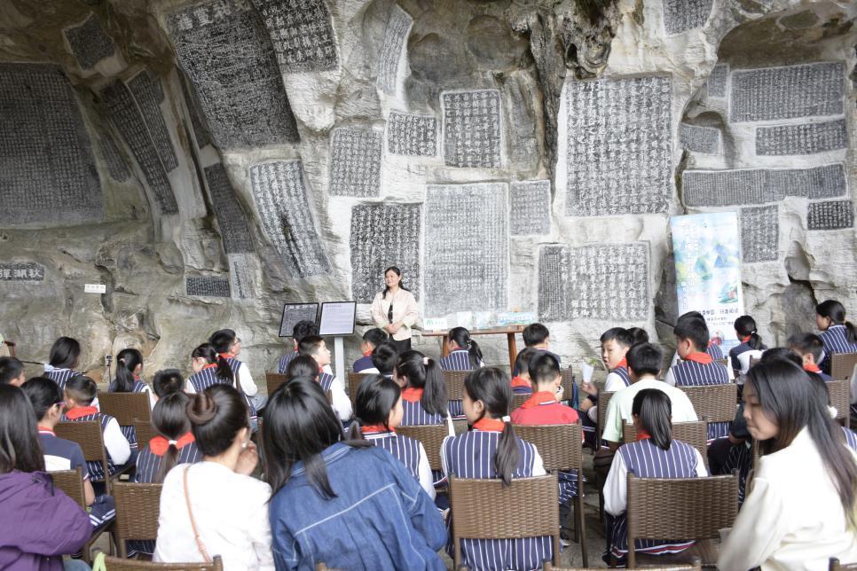 随后的展厅研学流动讲解环节,同学们化身“小小历史侦探”,在沈博士的引导下,通过《复水月洞铭》《桂林二十四岩洞歌》等珍贵石刻,探寻古人笔下“甲天下”的山水与科学成因的巧妙关联。从地质演变到诗词题刻,从生态保护到可持续发展,一场跨学科的探索之旅,让静态的书本知识在千年石刻与青山绿水间彻底“活”了起来。