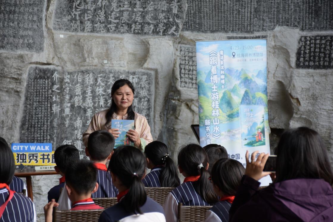 2026年4月23日下午,广西师范大学出版社魔法象童书馆和独秀书房在被誉为“古代书法艺术宝库”的桂海碑林博物馆,开展了一场《跟着博士游桂林山水》的新书分享会,本书作者中国地质科学院岩溶地质研究所沈利娜、广西师范大学出版社魔法象公司副总经理冒海燕、广西师范大学出版社独秀书房公司副总经理高冰波、桂林坚果精英小学校长张雪莲出席了本次活动。一场以“书香中国,行走阅读”为主题,融合新书发布、科普与经典诵读的特别活动在此举行,桂林坚果精英小学的数十名学生,跟随地质学家沈利娜博士,体验了一堂“会呼吸”的山水课。