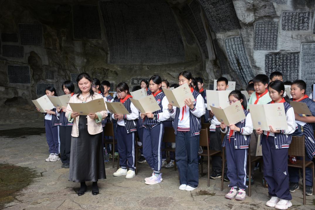 在龙隐岩前,沈利娜博士以一线地质学家的视角,带领同学们从眼前石刻所在的洞穴出发,串联起漓江源头、灵渠智慧、喀斯特地下世界直至会仙湿地保护,将书本中关于桂林地质、生态与人文的知识,生动地铺陈在真实的山水画卷前。沈博士带领同学们在龙隐岩一起朗诵描写桂林山水的经典古诗,用声音连接千年的诗意。古人把山水写在石头上,今人把山水读进心里。“船在青山顶上行”的古诗意境,在沈博士的科学解读下,化为对漓江水文与喀斯特地貌的直观认知。