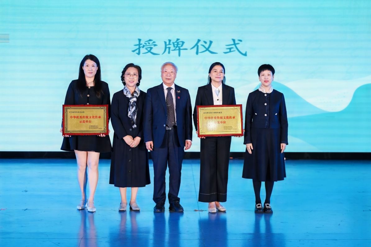 值得一提的是,在本次活动期间,浙江教育出版集团、浙江省传统文化促进会、浙江省老干部活动中心诗词协会,共同向浙江越秀外国语学院、绍兴市北海小学教育集团授牌——“中华优秀传统文化传承示范单位”,充分肯定了其多年来对中华优秀传统文化传承的示范效应。而《遇见宋词豪放派》《遇见宋词婉约派》等“遇见”系列图书,也将作为传承示范单位的重要阅读书目,助力青少年深耕经典文化,推动中华优秀传统文化在校园落地生根。